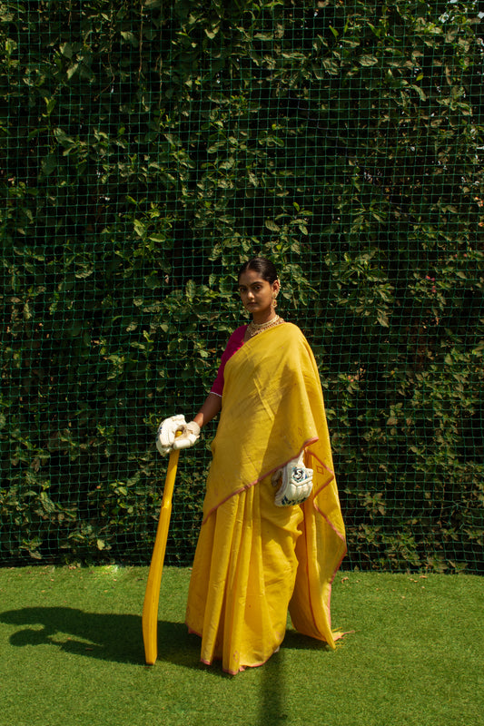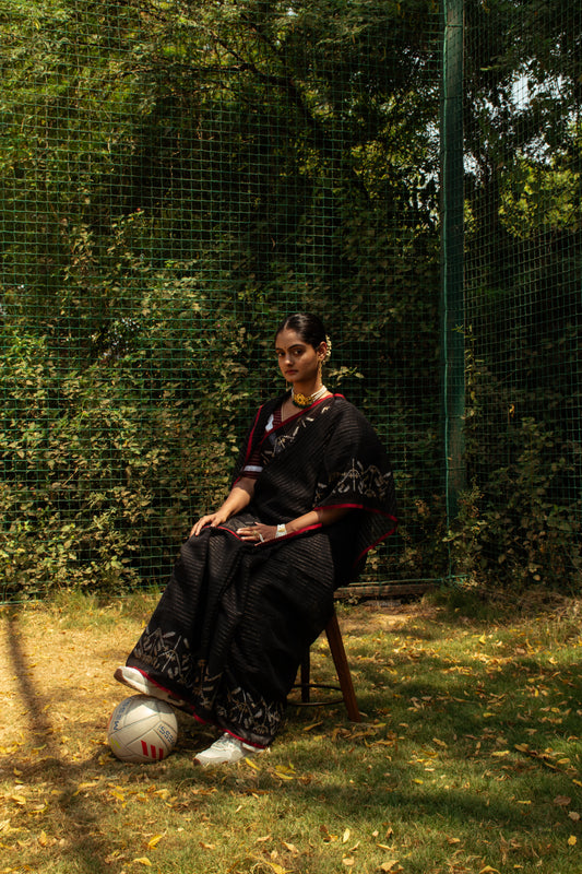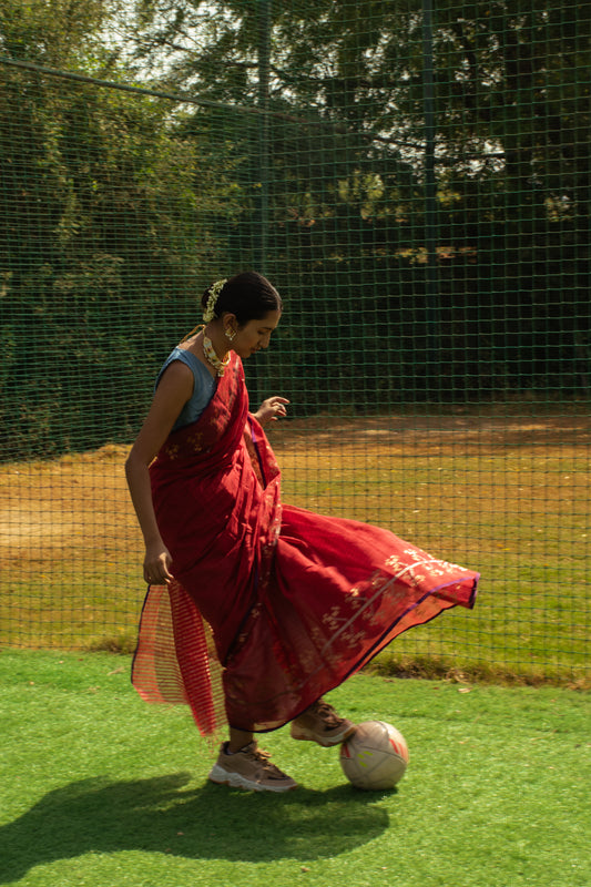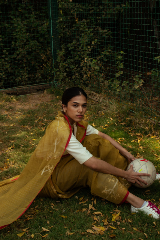 BEYOND'25 reimagines the saree as a symbol of strength, versality and contemporary grace. In this collection, we juxtapose traditional sarees with athletic elements like sports shoes and gloves, set against the dynamic backdrop of a play area. BEYOND'25 celebrates the saree's adaptability, illustrating that it transcends occasions and settings. It's not confined to tradition; it's a canvas for expression, movement and modernity.