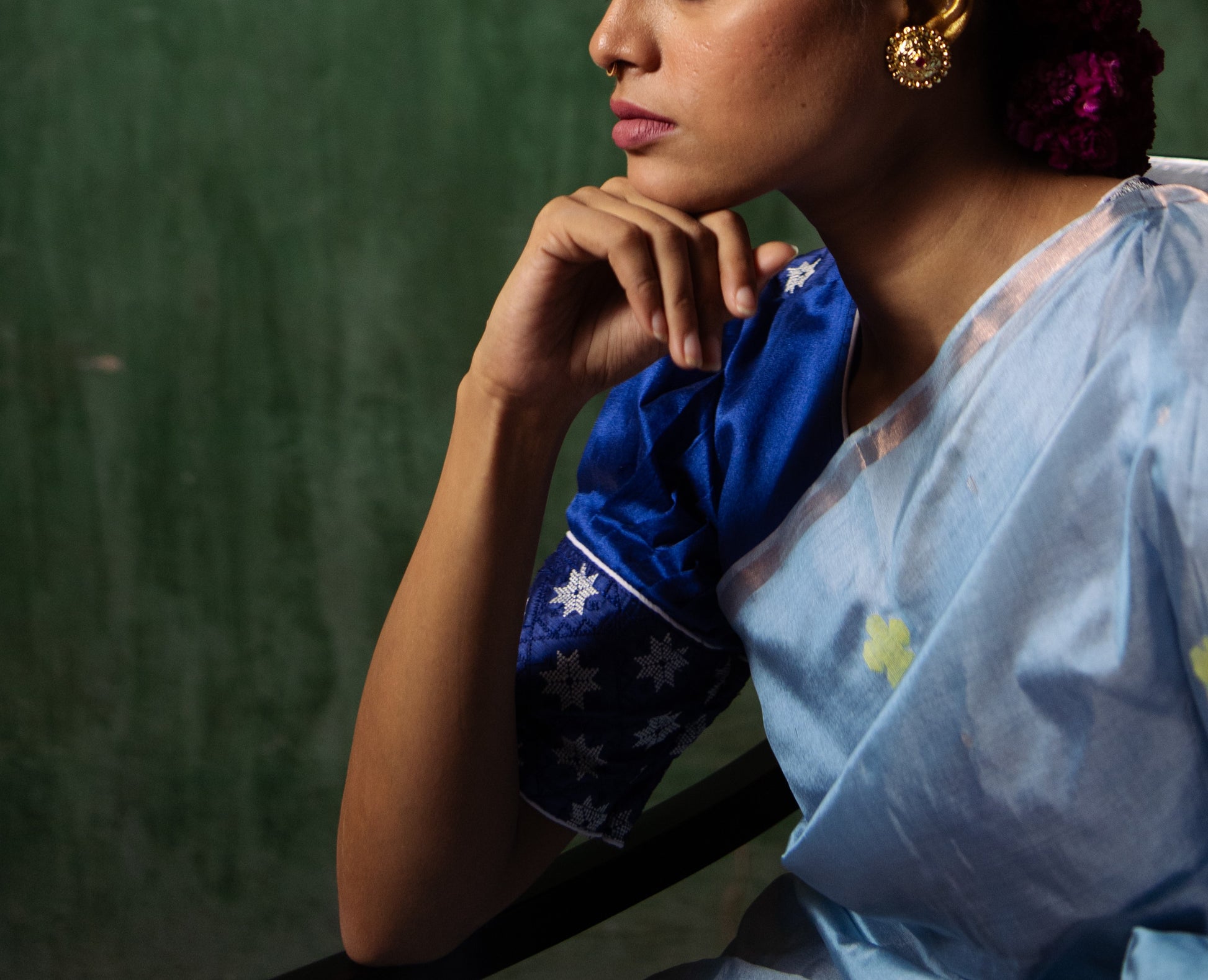 A rich blue raw silk blouse adorned with embroidered geometric flowers inspired by traditional alpona designs. This piece beautifully merges folk artistry with contemporary elegance, echoing cultural roots in every thread.
